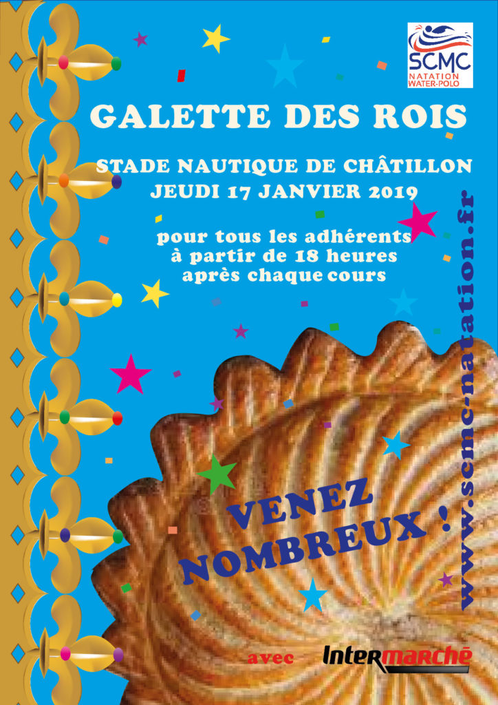 A tous nos adhérents : Venez partager une galette des rois jeudi 17 janvier 2019 au Stade nautique de Châtillon, après chaque cours à partir de 18 heures, jusqu-à 22 heures.